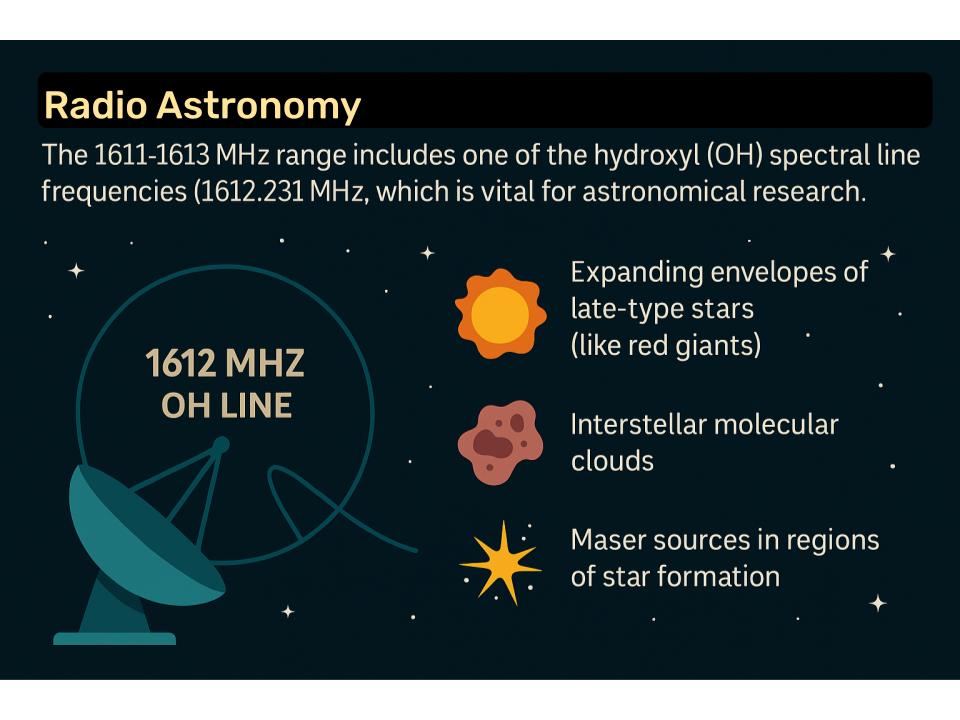 The 1611–1613 MHz range includes one of the hydroxyl (OH) spectral line frequencies (1612.231 MHz), which is vital for astronomical research.