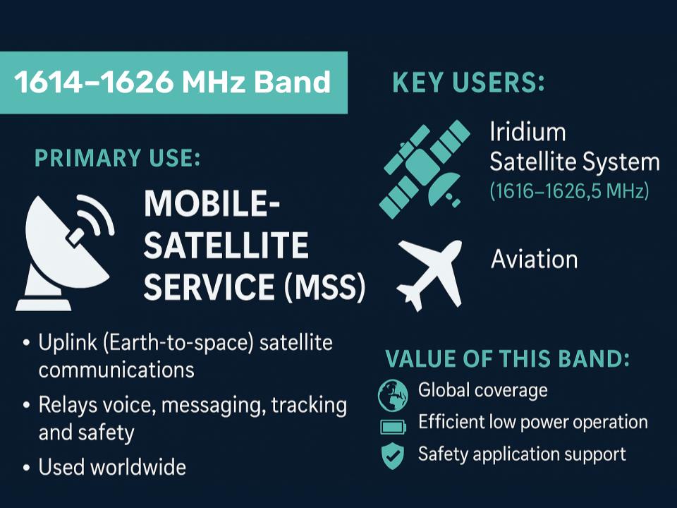 The 1614–1626 MHz band is one of the most important uplink ranges in the L-band spectrum. It enables critical global communication systems, including Iridium’s voice and data network, maritime safety communications, and aviation long-range operations. While adjacent to the protected radio astronomy segment, this band itself is an active, high-value satellite communications band used worldwide for both commercial and safety functions.