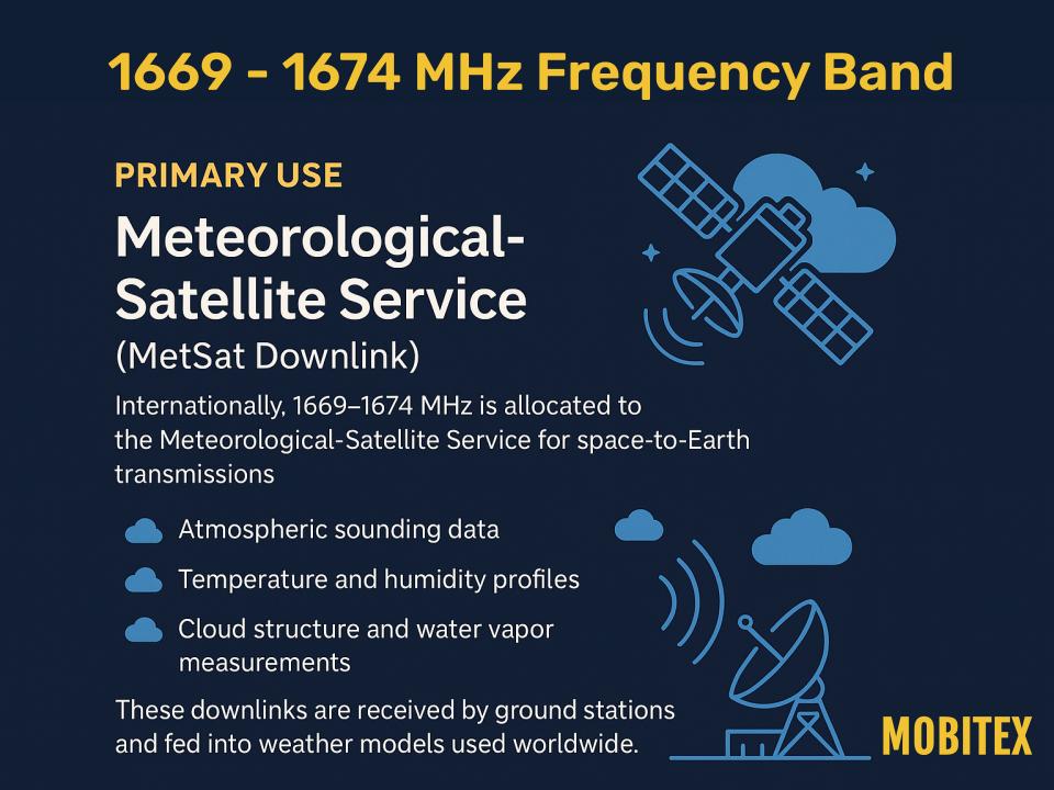 The 1669–1674 MHz band sits just above the globally protected radio astronomy segment and plays a very different role in the L-band ecosystem. Unlike the passive frequencies below it, this range supports active radio services, primarily for meteorological satellite downlinks.