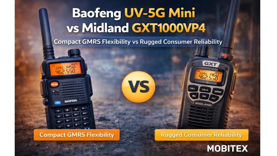 GMRS radios bridge the gap between casual walkie-talkies and professional two-way radio systems. Two popular options in this space are the Baofeng UV-5G Mini and the Midland GXT1000VP4.