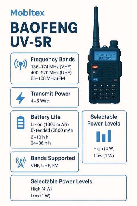 The Baofeng UV-5R remains one of the best-value handheld radios available today. It covers both VHF and UHF, offers flexible power control, solid battery life, and an unmatched range of accessories.